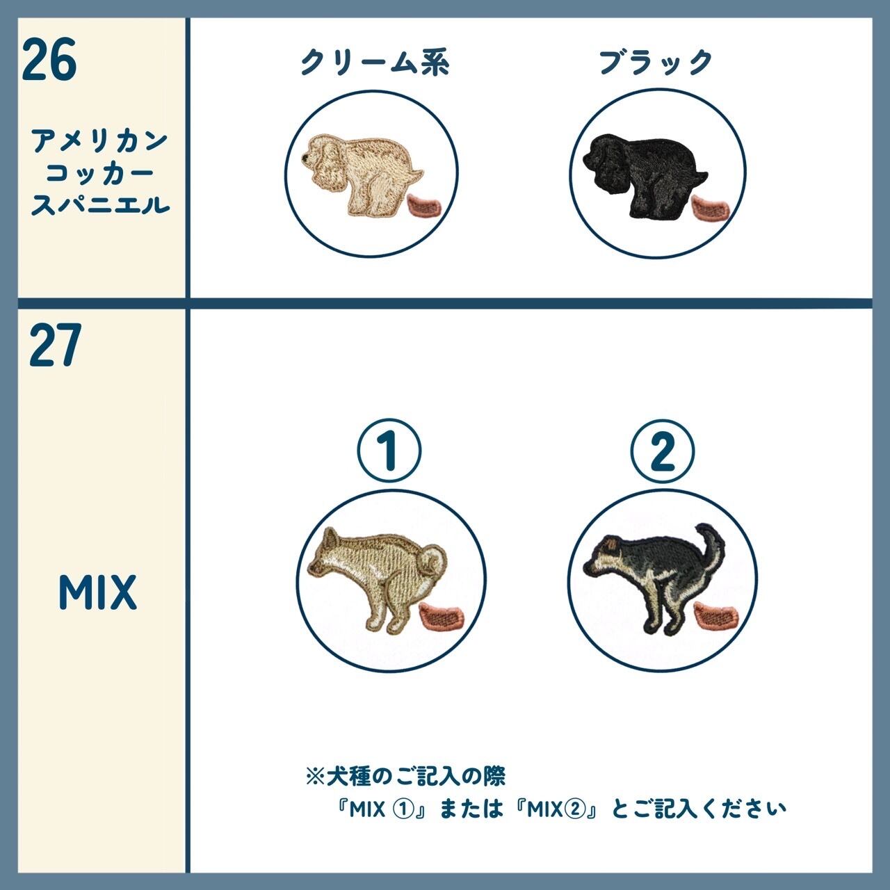 ・商品化されていない犬種や上記画像に載っていない毛色を記入された場合、ご連絡の上、キャンセルさせていただきます。