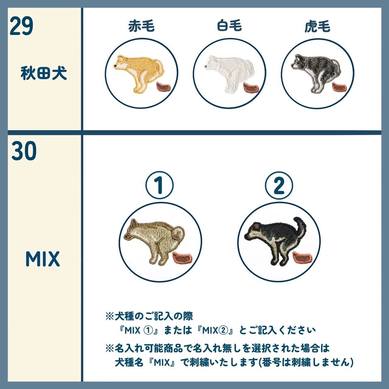 ・商品化されていない犬種や上記画像に載っていない毛色を記入された場合、ご連絡の上、キャンセルさせていただきます。