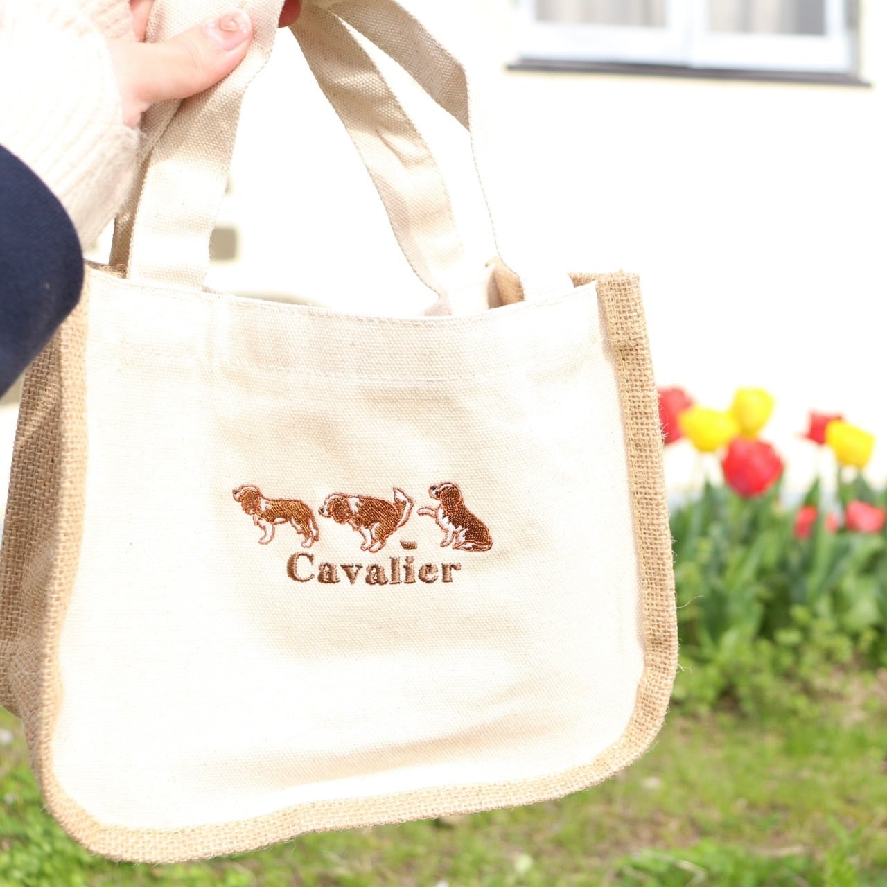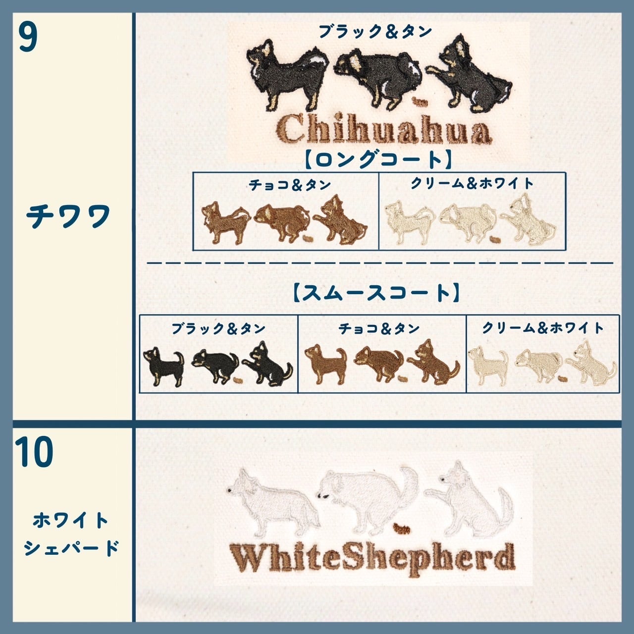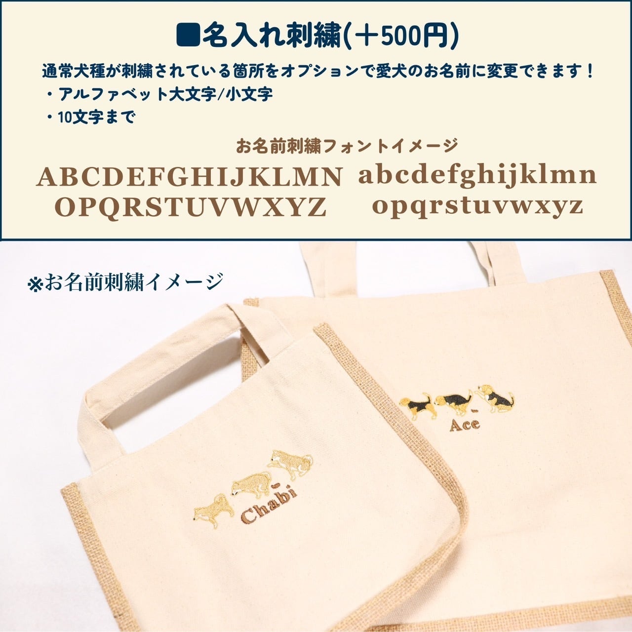 通常わんちゃん刺繍の下に犬種名を刺繍していますが、そちらを愛犬のお名前等に変更できます。