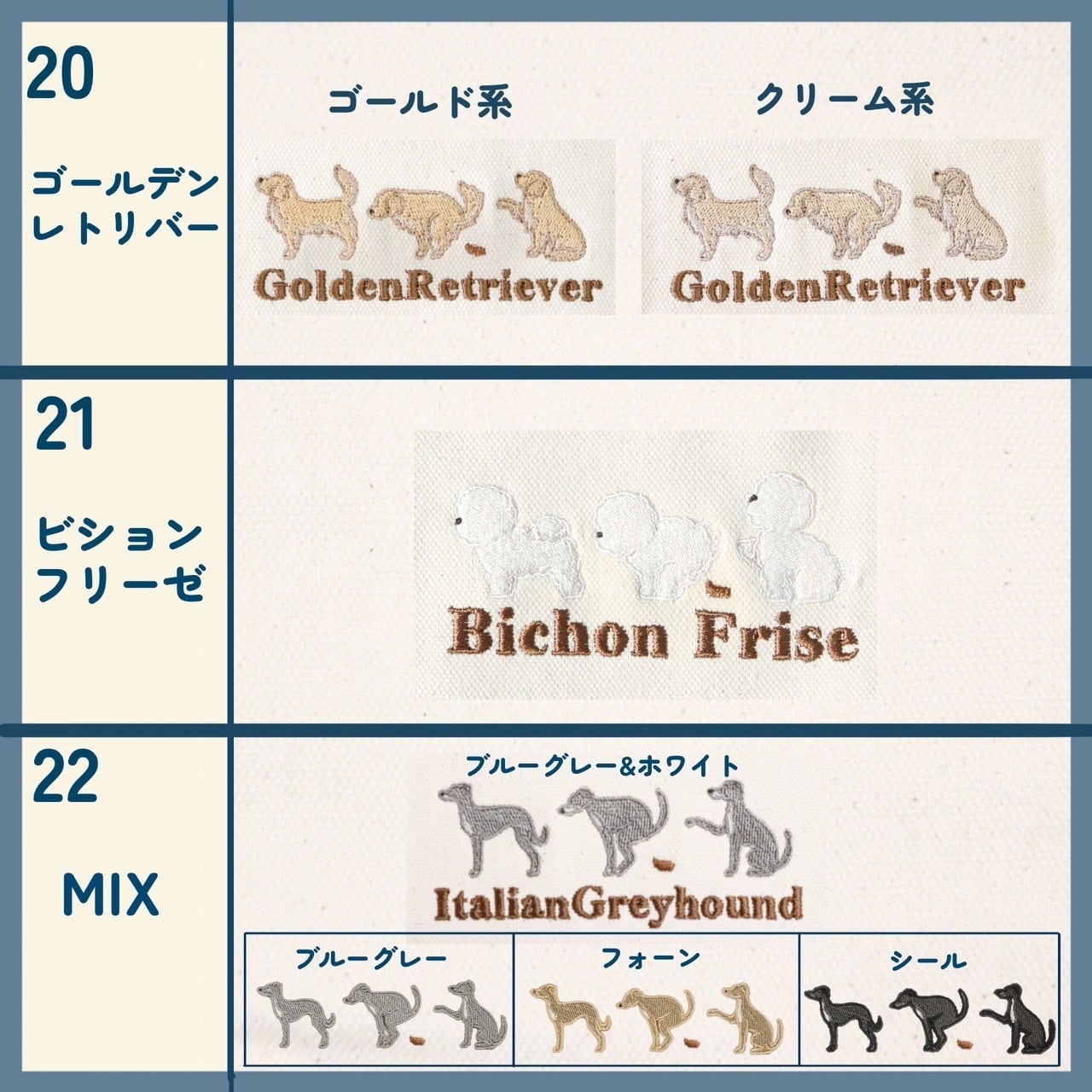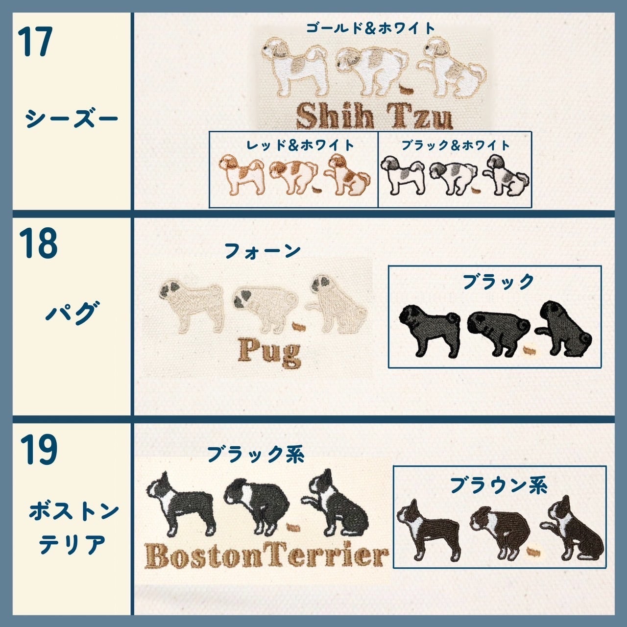 ・名入れ以外のデザインの変更(配置を変える、ひとつずつの毛色を変える、ひとつ減らす、裏面にも刺繍する等)はできかねますので予めご了承ください。